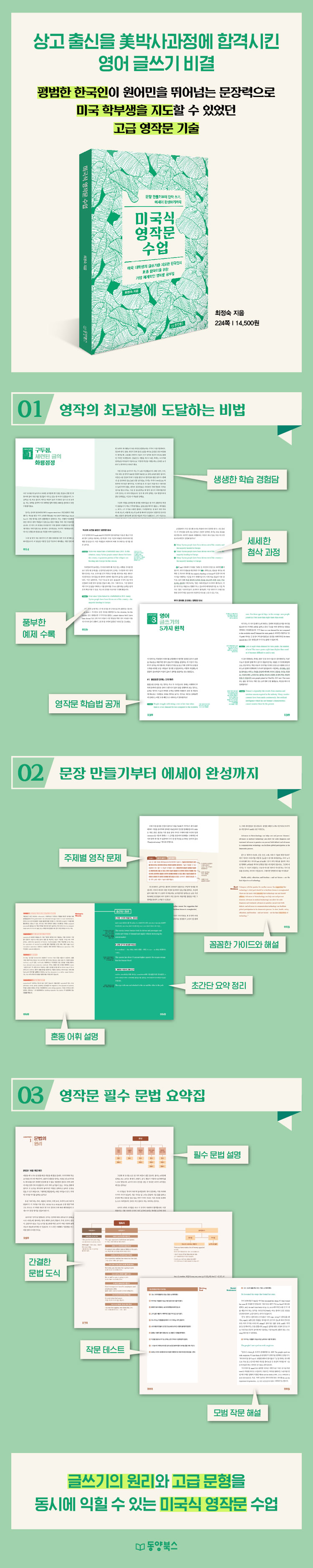 저자는 먼저 고급 영문을 만드는 5가지 방법을 제시하고 영작문 과제를 덧붙여 간결하고 명료한 영문을 만들어 내는 전략을 자세히 소개한다. 더불어 한국인이 영작 시 자주 범하는 실수를 조목조목 짚어내며 영문을 만들 때 염두에 두어야 할 원칙을 제시하고 단락과 글로 확장하는 전략을 구체적으로 전한다. 영작의 기초는 문법인 만큼 영어 글쓰기에 꼭 필요한 ‘영작문 맞춤 문법’도 정리해 실었다. 저자는 누구보다 치열하게 공부했던 자신의 경험담과 ‘영작은 부단한 노력과 지난한 반복을 통해 발전한다’는 지론을 내세워 고급 문형을 익히고 이를 응용해 자신만의 문장을 부지런히 만들어 내는 훈련 외에 영어 학습의 왕도는 없다고 말하며 꾸준한 암기를 무엇보다 강조한다.