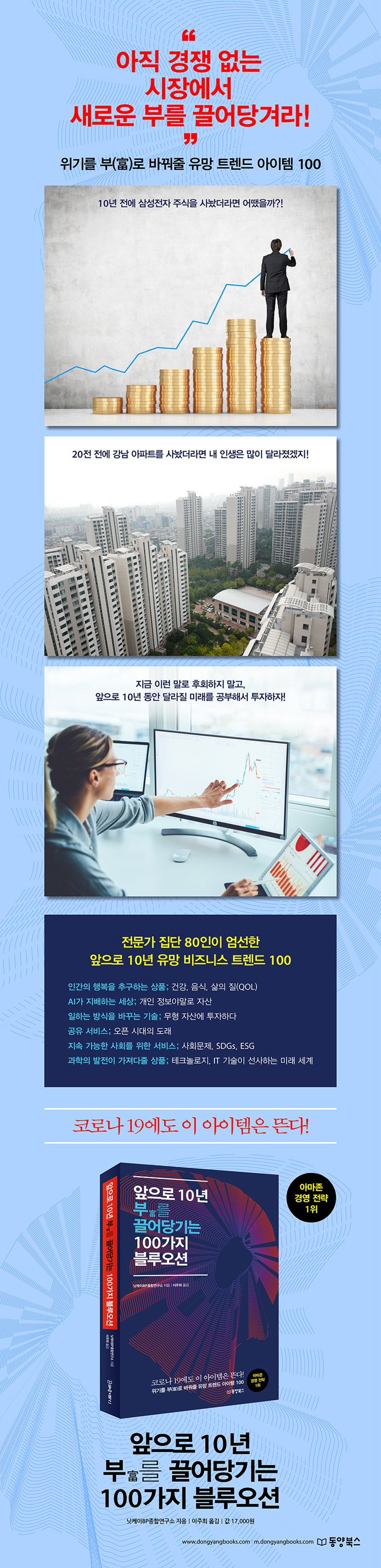 일본의 대표적인 경제신문 <니혼게이자이신문>이 만든 경제연구소, ‘닛케이BP종합연구소’가 앞으로 10년 후 크게 성장할 유망 트렌드 100가지를 선정해서 그 시장의 개요와 공략 포인트를 함께 소개하는 책, 『앞으로 10년 부를 끌어당기는 100가지 블루오션』은 바로 우리가 이런 후회의 말을 하지 않도록 미리 잘되는 사업 아이템이 뭔지, 뜨는 사업이 뭔지 귀띔해주는 미래 예측서이다.