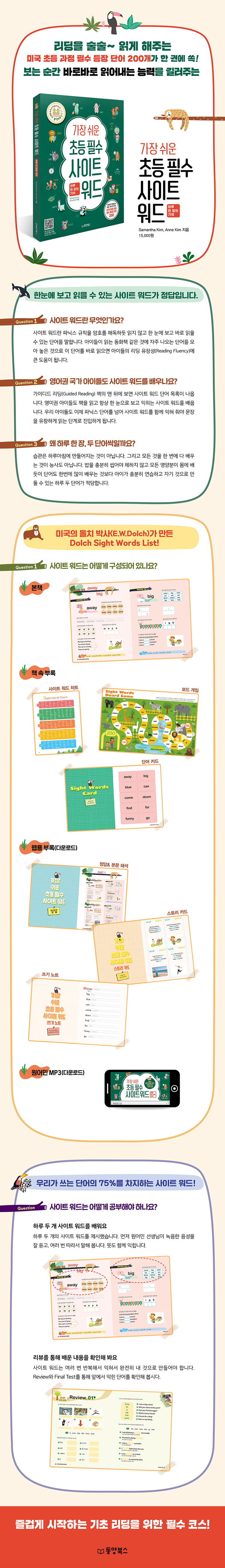 이 책은 리딩을 시작하기 전에 꼭 알아야 할 사이트 워드를 재미있게 익힐 수 있도록 기획되었습니다. 하루에 두 개씩 다양한 액티비티와 함께 쉽고 재밌는 스토리를 통해 자연스럽게 사이트 워드를 배울 수 있습니다. 어린이 책에서 자주 나오는 사이트 워드는 리딩에 필수적인 스킬입니다.