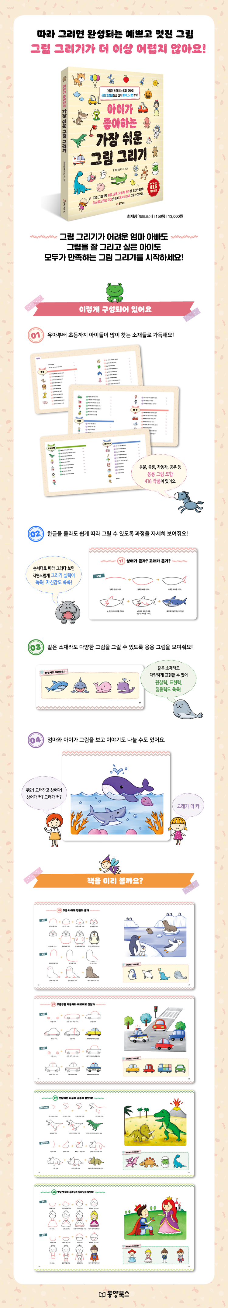 『아이가 좋아하는 가장 쉬운 그림 그리기』를 펼쳐놓고 아이들이 좋아하는 동물, 공룡, 자동차, 공주 등 인기 만점 그림, 416개의 그림(응용그림 포함)을 그려 보세요. 또한 엄마 아빠뿐만 아니라 한글을 모르는 유아, 한참 그리기를 해야 하는 초등학생까지 누구나 따라 그릴 수 있는 쉬운 구성으로 되어 있어 그리다 보면 순식간에 그리기 실력이 쑥쑥 자라있을 거예요.