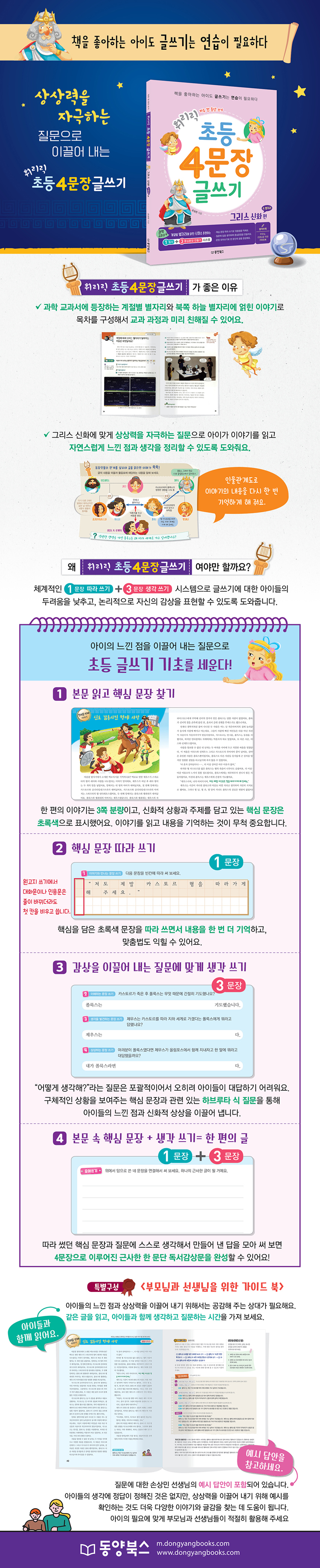 《휘리릭 초등 4문장 글쓰기》의 질문 흐름은 장문의 글을 쓰기 전 글의 개요를 짜는 것과 동일합니다. ‘그리스 신화 속 별자리 편’을 통해 상상력 넘치는 짧은 글쓰기를 익히면 긴 글쓰기에서도 막힘없이 휘리릭~! 써내려 갈 수 있을 것입니다.
