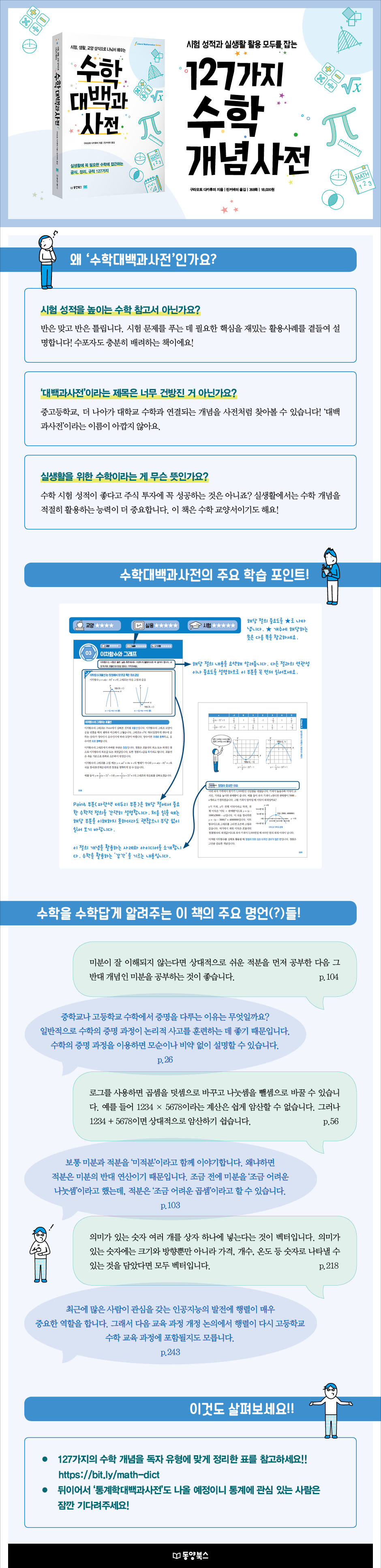 이 책은 시험 수학과 생활 수학의 경계에 있습니다. 127가지 개념을 설명하면서 시험 문제를 풀 때 무엇을 알아야 하는지 분명히 강조합니다. 심지어 시험 성적을 좋게 받으려면 어떤 공식은 꼭 외우라고 합니다. 하지만 여러분이 일상생활을 하면서 수학을 어떻게 활용하는지를 사례와 함께 소개하는 것도 소홀히 하지 않습니다. 높은 시험 점수를 받으면서도 재미있게 수학을 배운다는 두 마리 토끼를 모두 잡으려는 독자라면 관심 있게 읽어야 할 책입니다.
