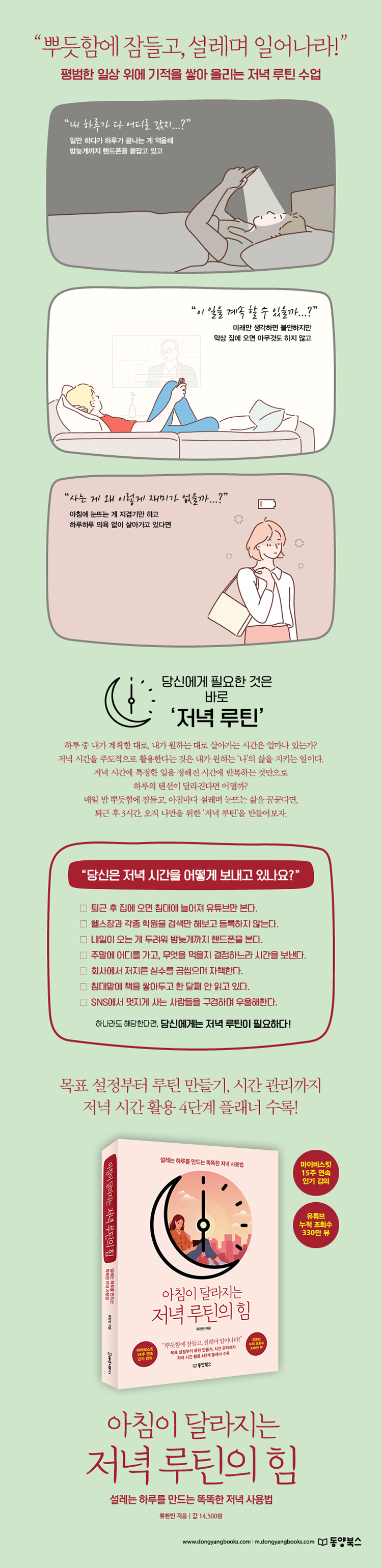물론 그 역시 처음에는 잘못된 목표 설정으로 일찌감치 좌절을 맛보기도 하고, 잘못된 시간 관리로 생활 패턴이 오히려 망가지기도 했다. 하지만 수없이 많은 시행착오 끝에 저녁 시간의 특성에 맞게 목표를 설정하고, 자신의 시간 사용 패턴에 맞게 저녁 루틴 만드는 법을 고안해냈다. 그리고 이 방법을 자신처럼 저녁 시간을 똑똑하게 사용하고 싶은 사람들을 위해 공유하기 시작했다. 그가 3년 전부터 꾸준하게 올리기 시작한 영상들은 자기계발러들의 호응을 얻어 총 누적 조회 수 330만 뷰를 돌파했으며, 온라인 클래스 플랫폼 ‘마이비스킷(mybiskit)’에서 진행한 강의는 15주 넘게 인기 클래스에 오르며 실용성을 인정받았다. 이 책은 단순히 저자 개인의 경험담을 공유하는 것을 넘어 자신의 목표와 시간에 맞게 루틴을 만들 수 있도록 안내하고 있기 때문에, 누구나 이 책을 읽고 나면 자신만의 ‘저녁 루틴’을 완성할 수 있다. 그뿐만 아니라 저녁 시간에 무엇을 해야 할지 고민하는 사람을 위해, 퇴근 후에 할 수 있는 사이드 프로젝트까지 친절하게 소개하고 있으므로 저녁 시간을 통해 인생의 터닝 포인트를 만들고 싶은 사람이라면 반드시 읽어야 할 필독서다.
