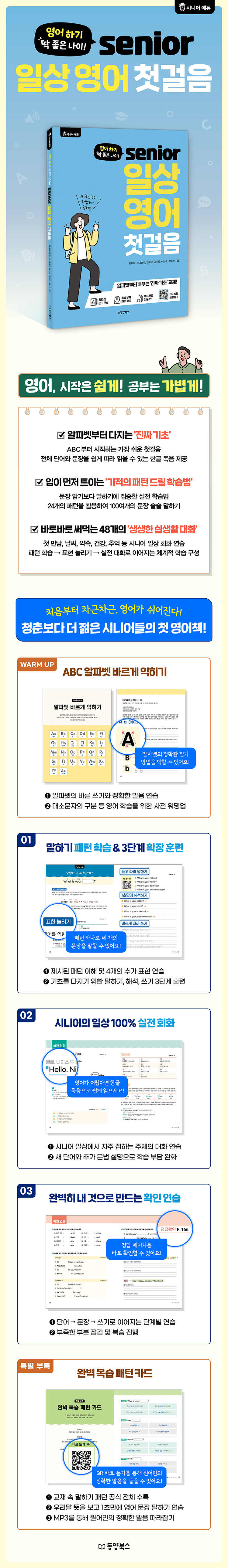 영어가 어렵고 멀게만 느껴졌던 이들을 위한, 시니어 맞춤형 영어 입문서이다. 알파벳부터 천천히 시작해 이름, 날씨, 취미, 교통, 건강, 추억 등 일상에서 흔하게 접할 수 있는 표현들을 큰 글씨로 한글 발음과 함께 익힐 수 있다. 매 챕터의 말하기 공식 패턴을 활용하여 4개의 추가 문장을 학습하며, QR코드를 통해 원어민 음성을 듣고 말하고 따라 쓰는 3단계 반복 연습으로 회화에 대한 자신감을 키울 수 있다.