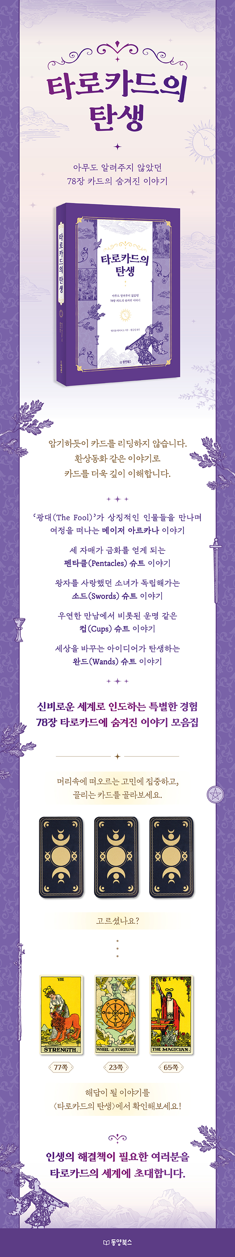 이 책은 아서 에드워드 웨이트가 기획하고 패멀라 콜먼 스미스가 그린, 가장 널리 쓰이는 라이더-웨이트-스미스 덱을 근거로 하여 타로카드의 숨은 이야기를 풀어갑니다. 총 22장의 메이저 아르카나에서는 광대(The Fool)가 마법사, 여교황, 은둔자, 죽음 등 상징적인 인물들을 만나며 카드 하나하나 살아 숨 쉬는 신비로운 여정이 펼쳐집니다. 총 56장의 마이너 아르카나에서는 세 자매가 권력을 얻게 되는 펜타클 슈트 이야기, 왕자를 사랑했던 소녀가 독립하며 성장해가는 소드 슈트 이야기, 우연한 만남에서 비롯된 운명 같은 컵 슈트 이야기, 세상을 바꾸는 아이디어가 탄생하는 완드 슈트 이야기로 구성되어 있습니다.