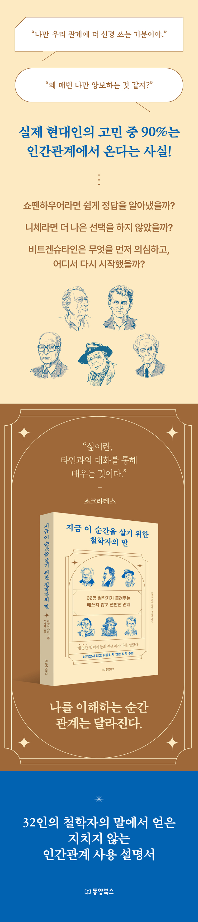 열심히 해도 늘 제자리 같고, 잘하려고 할수록 더 상처받는 이유는 무엇일까? 문제는 사람이 아니라 관계를 바라보는 관점에 있다. 철학은 어렵다는 통념을 깨고, 우리의 복잡한 인간관계에 비춰보면 놀라울 만큼 실용적이다. 그리고 그 여정을 돕기 위해 저자는 소크라테스부터 니체, 비트겐슈타인, 칸트까지 32인의 철학자가 남긴 소중한 문장을 각 주제의 길잡이로 배치했다.