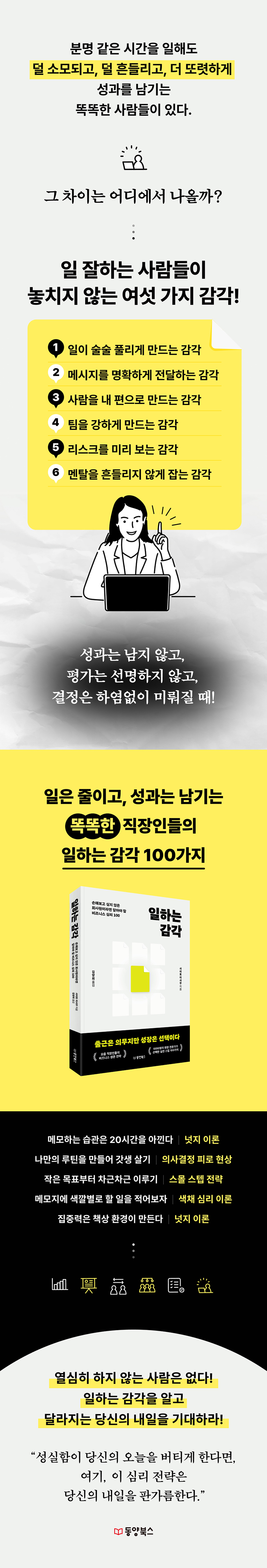 이 책은 단순한 요령 모음이 아니다. 좋은 실적을 내는 직장인 1000명에게 물었을 때, 업무에 직접 도움이 된 100가지를 도움이 된 순서대로 정리했다. 그리고 이 기술을 심리학과 행동과학으로 풀어내 더 쉽게, 더 똑똑하게 일하는 방법을 소개한다.