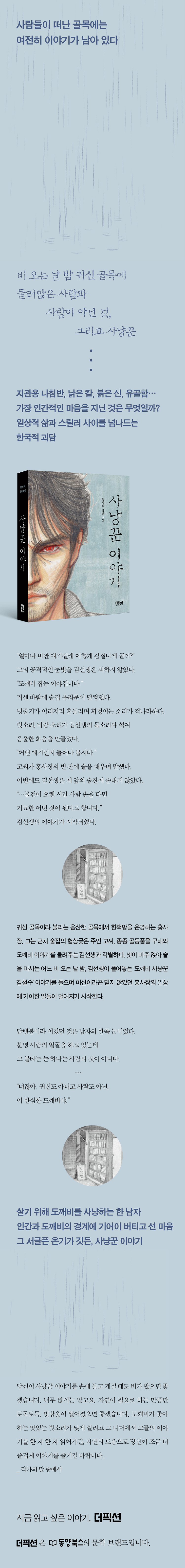 또한 이 작품은 현실과 환상이 자연스럽게 뒤섞이는 서사와 서서히 조여오는 불안, 인간이 외면해 온 감정들을 한국적 정서와 도시 괴담의 형식 속에 녹여내고 있다. 조용히 시작해 카타르시스를 끌어올리는 서사는 독자를 골목 깊숙한 곳으로 끌어들이고, 마지막 순간까지 진실을 쉽게 허락하지 않는다. 그래서 이 작품은 익숙한 일상 한가운데에서 시작되는 기묘한 이야기이기도 한 것이다. 우리가 무심히 지나쳐온 일상의 틈을 들여다보게 만들고, 그러다 익숙한 세계가 낯설게 보이는 순간, 독자는 깨닫게 된다. 어쩌면 사냥꾼과 도깨비는 멀리 있지 않다는 것을. 또한 우리가 잊고 지낸 것들은 정말 사라진 것인지, 아니면 다른 모습으로 곁에 남아 있는 것인지 의문을 품게 된다.